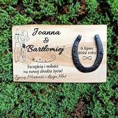 Oryginalny prezent - deska z grawerem zdjęcia, dowolnym tekstem oraz podkową. Świetnie się sprawdzi jako prezent na ślub.