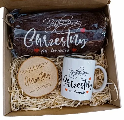 Wyjątkowy zestaw dla Najlepszego Chrzestnego to gwarancja prawdziwego, osobistego uznania. Składa się z wysokiej jakości pudełka, kubka, ręcznika i podkładki, które zostały starannie zaprojektowane z myślą o celebracji tej szczególnej osoby w Twoim życiu.