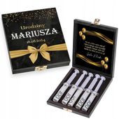 Konstrukcja z solidnego drewna brzozowego, uzupełniona metalowym zamknięciem i precyzyjnym nadrukiem na wieku, zapewnia niezawodną trwałość i elegancję. W zestawie 5 strzykawek z gumeczkami, które symbolizują hojny gest, ten zestaw gwarantuje dyskretne i praktyczne opakowanie, gotowe do personalizacji, by każdy moment był wyjątkowy.