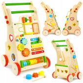 Ten precyzyjnie wykonany drewniany pchacz charakteryzuje się nie tylko solidną konstrukcją ze sklejki drewnianej, ale także kompleksowym zestawem edukacyjnych atrakcji. Posiada liczydło, cymbałki, labirynt, ruchome kulki, trybiki, lusterko i sorter kształtów, które idealnie wspierają rozwój zdolności manualnych i poznawczych dziecka na każdym etapie wzrostu.
