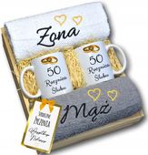 Zestaw zawiera 2 ręczniki o wymiarach 50x100cm z precyzyjnym haftem wzdłuż krótszego boku, 2 ceramiczne kubki o pojemności 330ml w kolorze białym z personalizowanym napisem rocznicy ślubu, drewnianą skrzynkę o wymiarach 30x20x10cm z wyściółką z wełny drzewnej, zawieszkę do wypisania oraz ozdobne opakowanie w celofan. Wszystko to tworzy spersonalizowany prezent gotowy do wręczenia, podkreślając niezawodność i dbałość o detale w każdym elemencie.