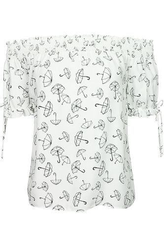 Bluzka typu Hiszpanka firmy Primark w kolorze białym. Uszyta z wzorzystego materiału (w parasole). Na krótki rękaw. Góra elastyczna - dopasowująca się do sylwetki. Na zakończeniach rękawów wszyta wewnątrz gumka, oraz doszyte ozdobne wiązanie. Materiał miły w dotyku i wysokogatunkowy.