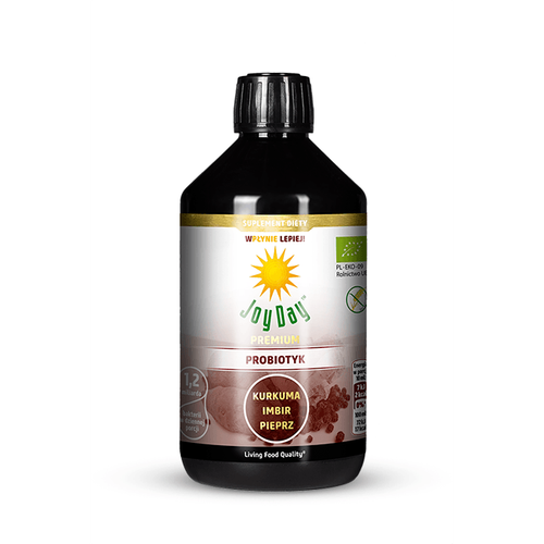Rozcieńczony Probiotyk Joy Day Kurkuma charakteryzuje się przyjemnym korzennym aromatem i naturalnym, kwaskowo orzeźwiającym smakiem kurkumy i imbiru. Nie jest ostry!