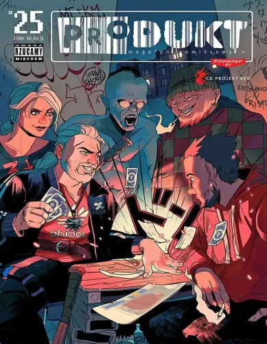 "Legendarny komiksowy magazyn znowu powraca! Kilka słów od Michała Śledzia Śledzińskiego, red nacza Produktu: Mamy Wiedźmina w domu! Znaczy... Na Osiedlu Swoboda. Pięknie nam Błażej Qrjusz Kurowski tę okładkę przygotował, prawda? To nasz okładkowy główny wariant, kontynuujący pomysł maszapu CD PROJEKT RED x PRODUKT. Redzi, oczywiście, ponownie wspierają nas w procesie produkcji (dzię-ku-je-my!). Wariantów okładki znów mamy cztery, tym razem bez blanka. Na kolejnych, równie cudownych, znajdziecie prace Joanna Karpowicz, xuh, javvie. A z Geraltem (Panie Andrzeju, dziękujemy, bo wszystkie Wiedźminy nasze są, jak śpiewała Majka Jeżowska) spotkacie się i na naszych kolorowych stronach (mamy ich 44 w #25) w bardzo produktowej odsłonie serii, zmajstrowanej przez Bartosza Sztybora (laureata Nagrody Hugo), Piotra Nowackiego (laureata Nagrody Białego Kurczaka) i mnie (laureata Nagrody im. Papcia Chmiela). Będzie jajo! Tak, serio jajo. A to tylko jedna z wielu komiksowych atrakcji, które na Was czekają podczas lektury 190 stron nowego numeru. Będzie sporo śmiechu, wzruszeń, debiut poza niezalem, szeroko otwartych oczu, gościnnych występów i doskonałej publicystyki z hologramem jakości All Comics Are Beautiful ACAB News 24."