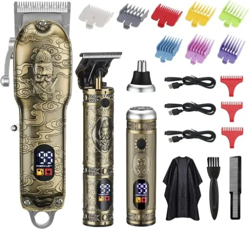Ten zestaw maszynek fryzjerskich zapewnia wszystko, czego potrzebujesz do stylizacji. Od strzyżenia włosów, przez modelowanie brody, aż po delikatne usuwanie zbędnych włosków z nosa. Kolejnym atutem jest zastosowanie wbudowanych ekranów LCD ukazujących stan baterii, dzięki czemu masz pełną kontrolę nad czasem pracy urządzenia.
