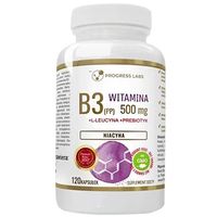 Progress Labs Witamina B3 500 mg w formie kapsułek stanowi wszechstronne uzupełnienie codziennej diety, szczególnie dla osób dbających o zdrowie układu sercowo-naczyniowego, skóry oraz funkcje poznawcze. Dzięki wysokiej dawce niacyny (witamina B3) na kapsułkę, ten suplement wspiera prawidłowe funkcjonowanie organizmu, pomagając w utrzymaniu zdrowego poziomu cholesterolu oraz promując regenerację i nawilżenie skóry. Unikalny skład produktu, wzbogacony o inulinę, działa korzystnie na zdrowie jelit, wspierając procesy trawienne i układ odpornościowy.