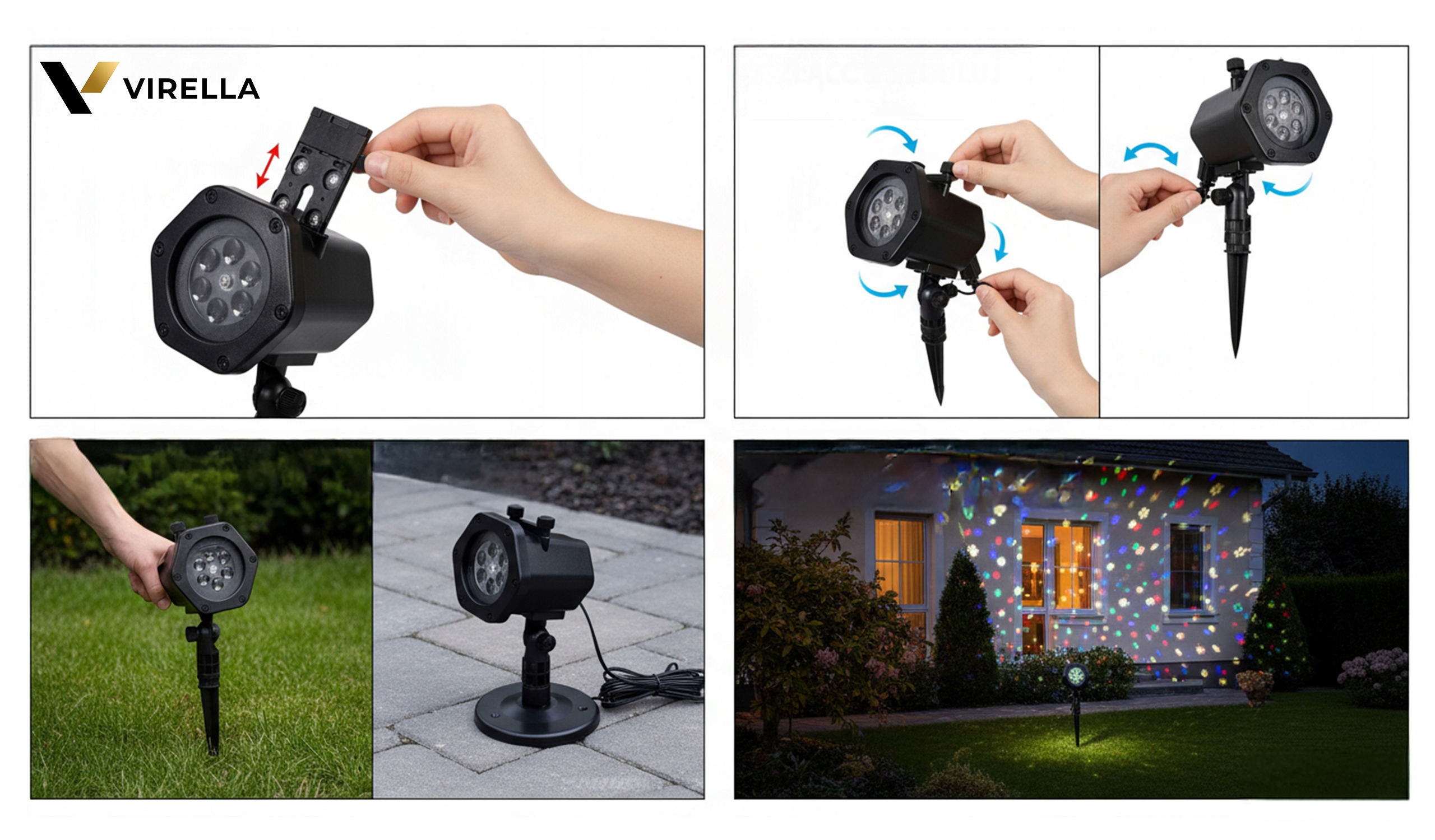 Wybierz motyw, wsuń kartę, ustaw 2–5 m od powierzchni i włącz. Bez drabiny, bez plątaniny lampek.