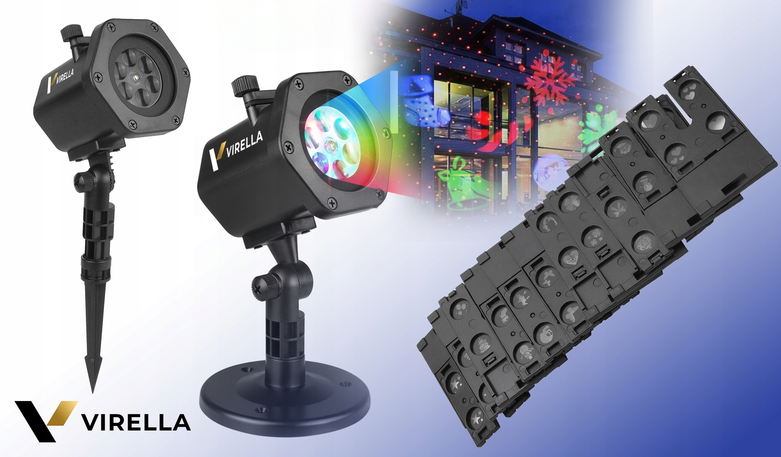 W zestawie: projektor VIRELLA, 12 kart (48 wzorów), stojak, szpikulec, zasilacz 5 m, instrukcja. Otwierasz pudełko i masz gotowy komplet.