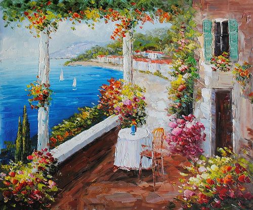 Barwna i ciepła kompozycja malarska odznaczająca się atrakcyjną stylistyką! Obraz olejny o tematyce śródziemnomorskiej. Wyrazista praca malarska, wykonana pędzlem i szpachlą!