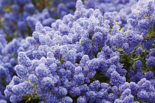 Kwiaty rozwijają się na początku czerwca, zachowują sie przez miesiąc, często roślina powtarza kwitnienie jesienią. Są drobne, ale bardzo liczne, mają barwę fioletową, lub żywo niebieską. Kwiaty zebrane są w okazałe, lekko przewisające wiechy.Jest to krzew zimozielony.Ze względu na piękne kłęby niebieskich kwiatów(najpierw jasno niebieski z wiekiem ciemnieje) krzew ten jest bardzo poszukiwany do każdego ogrodu. | |