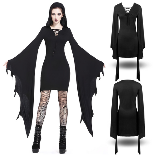 Nasza krótka sukienka inspirowana skrzydłami nietoperza, strojem czarownicy oraz kultowym stylem Morticii, to idealny wybór na tematyczne imprezy, festiwale i przebrania Halloween.