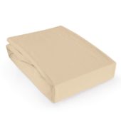 Beżowe prześcieradło ochronne z gumką wyprodukowane przez Darymex z dwóch rodzajów materiałów: tkaniny jerseyowej z ochronną warstwą poliuretanową(PU) i cienkiej dzianiny jerseyowej doszywanej z boku ochraniacza.