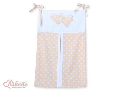 Oryginalny przybornik ułatwiający przechowywanie pieluszek "pod ręką". Przybornik bardzo łatwo przymocować do łóżeczka lub komody. Rozcięcie na przodzie pozwala na łatwe wkładanie lub wyciąganie pampersów. Przód przybornika ozdobiony jest dużymi aplikacjami serduszek. Dno usztywniane.