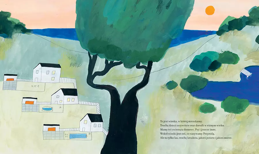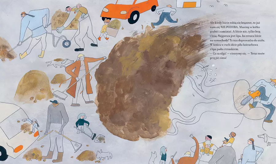 Jest sobie wioska. W wiosce mieszkają ludzie. Dzieci i dorośli. Wokół wioski jest coś, co się nazywa Przyroda. Dużo lasu, trochę krzaków, jakieś jezioro i jakieś morze. Mieszkańcy wioski lubią Przyrodę, na przykład piękne kolorowe liście jesienią. Ale kiedy zbrązowieją i zgniją – nie, taka Przyroda tylko przeszkadza, najprościej będzie wyciąć drzewo i problem z głowy. Tylko co dalej? W swojej książce obrazkowej Emma Adbåge w przewrotny sposób pokazuje, do czego może doprowadzić bezmyślne niszczenie przyrody. Emma Adbåge to jedna z najbardziej cenionych szwedzkich autorek i ilustratorek młodego pokolenia. W niezwykle oryginalny, dowcipny, ale i bezkompromisowy sposób portretuje w swej twórczości zarówno dzieci, jak i dorosłych. W 2018 roku za autorską książkę „Dołek" została uhonorowana Nagrodą Augusta. Wcześniej była kilkukrotnie nominowana do tego najważniejszego wyróżnienia na szwedzkim rynku wydawniczym. Jest także laureatką międzynarodowych nagród, m.in. Deutscher Jugendliteraturpreis.