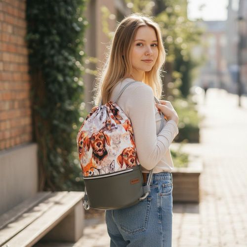 Górna część plecaka ozdobiona jest kolorowym wzorem przedstawiającym różne rasy psów, który nadaje mu wyjątkowego charakteru. Spód wykonano z wodoodpornego materiału w kolorze ciemnej zieleni, dzięki czemu zawartość plecaka jest chroniona nawet w deszczowe dni. Zamykany na solidny sznurek, z łatwym dostępem do wnętrza. W środku znajduje się kieszeń wewnętrzna na drobiazgi, a z boku – praktyczna kieszeń zewnętrzna.