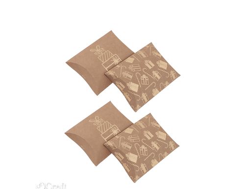 Pudełka składane typu pillow box z motywem złotych prezentów sprawdzą się doskonale jako opakowania na świąteczne podarunki. Można schować do nich rozmaite, drobne upominki takie jak biżuteria lub vouchery podarunkowe. Te tekturowe pudełka nadają się także do dodatkowego zdobienia np. elementami florystycznymi, wstążeczkami lub naklejkami Pudełeczka są do samodzielnego złożenia.
