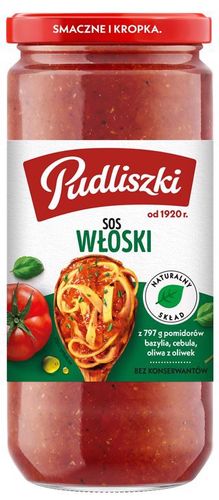 przecier pomidorowy 56 %;pomidory 26 %;warzywa (cebula 8,3 %, marchew);cukier;sól;czosnek 0,75 %;olej rzepakowy;bazylia 0,4 %;oliwa z oliwek 0,3 %;regulator kwasowości (kwas cytrynowy);zioła;przyprawy