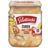 woda, ziemniaki 19%, zakwas na żur 18% [woda, mąka zytnia 9%, mąka pszenna razowa, czosnek],cebula, kiełbasa wieprzowa 4,5% [mieso wieprzowe, woda, skrobia modyfikowana, sól, błonnik pszenny, przyprawy, majeranek, ekstrakty przypraw, substancja zagęszczajaca (E407), stabilizatory (E450, E451), regulator kwasowości (E262), przeciwutleniacz (E316), substancja konserwujaca (E250), jadalna osłonka (jelito wieprzowe)], boczek wieprzowy wędzony 4,5% [boczek wieprzowy, woda, sól, stabilizatory (E450,E331), glukoza, ekstrakty przypraw, przeciwutleniacz (E316), substancja zagęszczajaca (E407), regulator kwasowości (E262), substancja konserwująca (E250)], śmietanka (z mleka), skrobia modyfikowana, mąka pszenna, sól, czosnek 0,4%, cukier, naturalny aromat, suszony majeranek, przyprawy, suszony liść laurowy. Produkt może zawierać seler. Bez wzmacniaczy smaku. Bez barwników.