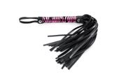 Klasyczny flogger wykonany ze skóry PU, drewna i metalu bez niklu z fioletowym skrętem w kształcie lamparta. Rączka jest zaprojektowana dla idealnego chwytu i jest bardzo wytrzymała. Na uchwycie, czarny nadruk jest pluszowy jak w dotyku, podczas gdy fioletowa część jest błyszcząca. Na górze ma skórzany pierścień do przechowywania i wyświetlania celów. Średnica pudełka to 25x8x4 cm.