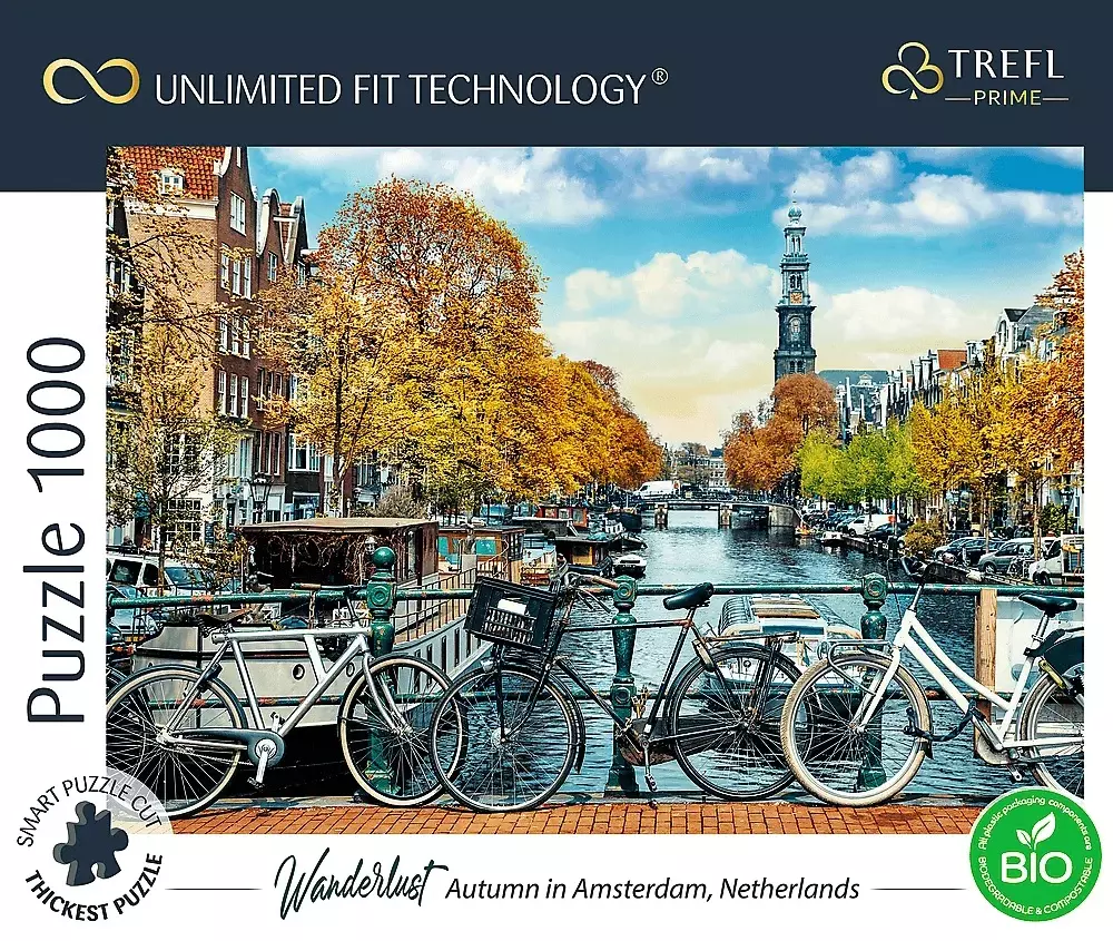 Puzzle z serii Trefl Prime UFT składające się z 1000 elementów są dedykowane prawdziwym miłośnikom układanek. Puzzle przedstawiają malowniczą jesień w Amsterdamie. Puzzle zostały wykonane z wysokiej jakości materiałów z zastosowaniem najgrubszej tektury, unikalnych kształtów oraz specjalnej metody cięcia. Dzięki temu możemy stworzyć indywidualny kolaż oraz łatwo przenieść całą układankę. Ponadto poszczególne elementy produktów UFT są wykonane z materiałów ekologicznych. Worek zsypowy oraz stickery na pudełku zostały wykonane z folii biodegradowalnej. Produkty nie są opakowane w folię termokurczliwą. Wymiary obrazka po ułożeniu: 68.3 x 48.0 cm