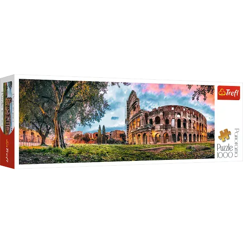 Panoramiczne puzzle 1000-elementowe ze zdjęciem przedstawiającym Koloseum o poranku. Po ułożeniu powstanie obrazek o wymiarach 97.0 x 34.0 cm. Wysoką jakość, nasycenie kolorów i bezpieczeństwo układania zapewnia kalandrowany papier odbijający światło, pokryty ekologicznymi farbami spożywczymi.