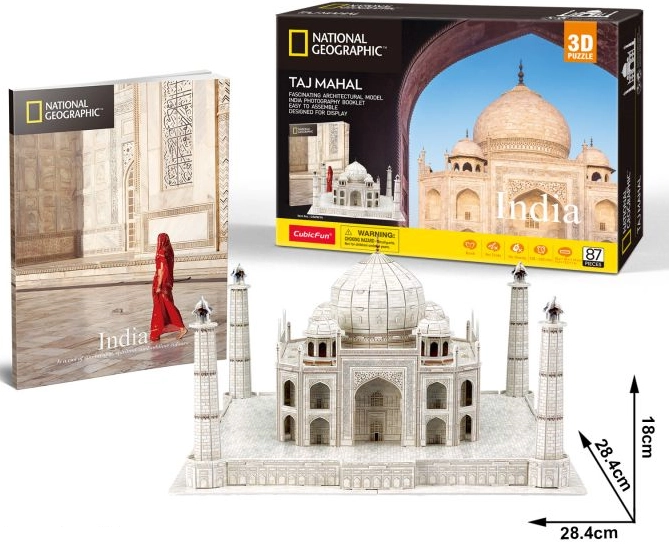 Przedstawiamy puzzle Taj Mahal na licencji National Geographic. W opakowaniu znajduje się 87 puzzli wykonanych ze specjalnego materiału przypominającego piankę. Puzzle są ponumerowane, ponacinane i umieszczone na arkuszach. Wystarczy bez użycia siły wycisnąć element z arkusza i zmontować go zgodnie z dołączoną instrukcją, bez użycia kleju ani specjalnych narzędzi. Poza puzzlami w opakowaniu znajduje się praktyczny przewodnik z ciekawostkami zawierający 28 stron. Wielkość budowli po złożeniu: 50.5 x 31.0 x 45.5 cm