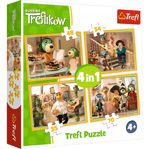 Nie jedna, nie dwie, ale aż cztery układanki zamknięte w jednym pudełku to prawdziwa gratka dla miłośników puzzli! Po ułożeniu otrzymamy cztery obrazki różnej wielkości przedstawiające Rodzinę Treflików. Zestaw doskonale spełnia oczekiwania rodzeństwa – każdy ułoży swój ulubiony obrazek nawet w tym samym czasie. Zróżnicowana liczba elementów pozwala na zabawę zarówno młodszym, jak i nieco starszym dzieciom. Dodatkowym urozmaiceniem zabawy może być układanie na czas, porównywanie obrazków, szukanie różnic i podobieństw. Puzzle są przyjazne dziecku! Do produkcji puzzli użyliśmy materiałów ekologicznych, co gwarantuje bezpieczeństwo i radość zabawy. Zawartość opakowania: • układanka 70 elementów, • układanka 54 elementy, • układanka 48 elementów, • układanka 35 elementów.
