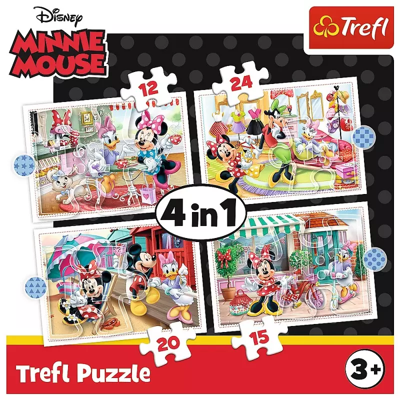Puzzle 4w1 z grafikami przedstawiającymi przygody Myszki Minnie to cztery układanki różnej wielkości z uwielbianymi przez dziewczynki i chłopców bohaterami bajek. Zestaw doskonale spełnia oczekiwania rodzeństwa – każdy ułoży swój ulubiony obrazek nawet w tym samym czasie. Zróżnicowana liczba elementów pozwala na zabawę zarówno młodszym, jak i starszym dzieciom. Wysoką jakość, nasycenie kolorów i bezpieczeństwo układania zapewnia kalandrowany papier odbijający światło, pokryty ekologicznymi farbami spożywczymi.
