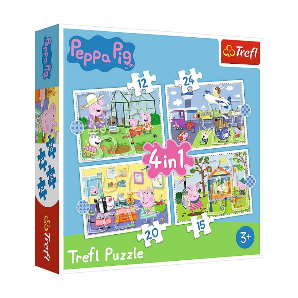 Nie jedna, nie dwie, ale aż cztery układanki zamknięte w jednym pudełku to prawdziwa gratka dla miłośników puzzli! Po ułożeniu otrzymamy cztery obrazki różnej wielkości przedstawiającymi podróże Świnki Peppy.