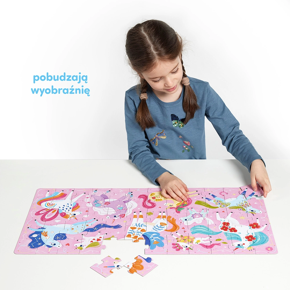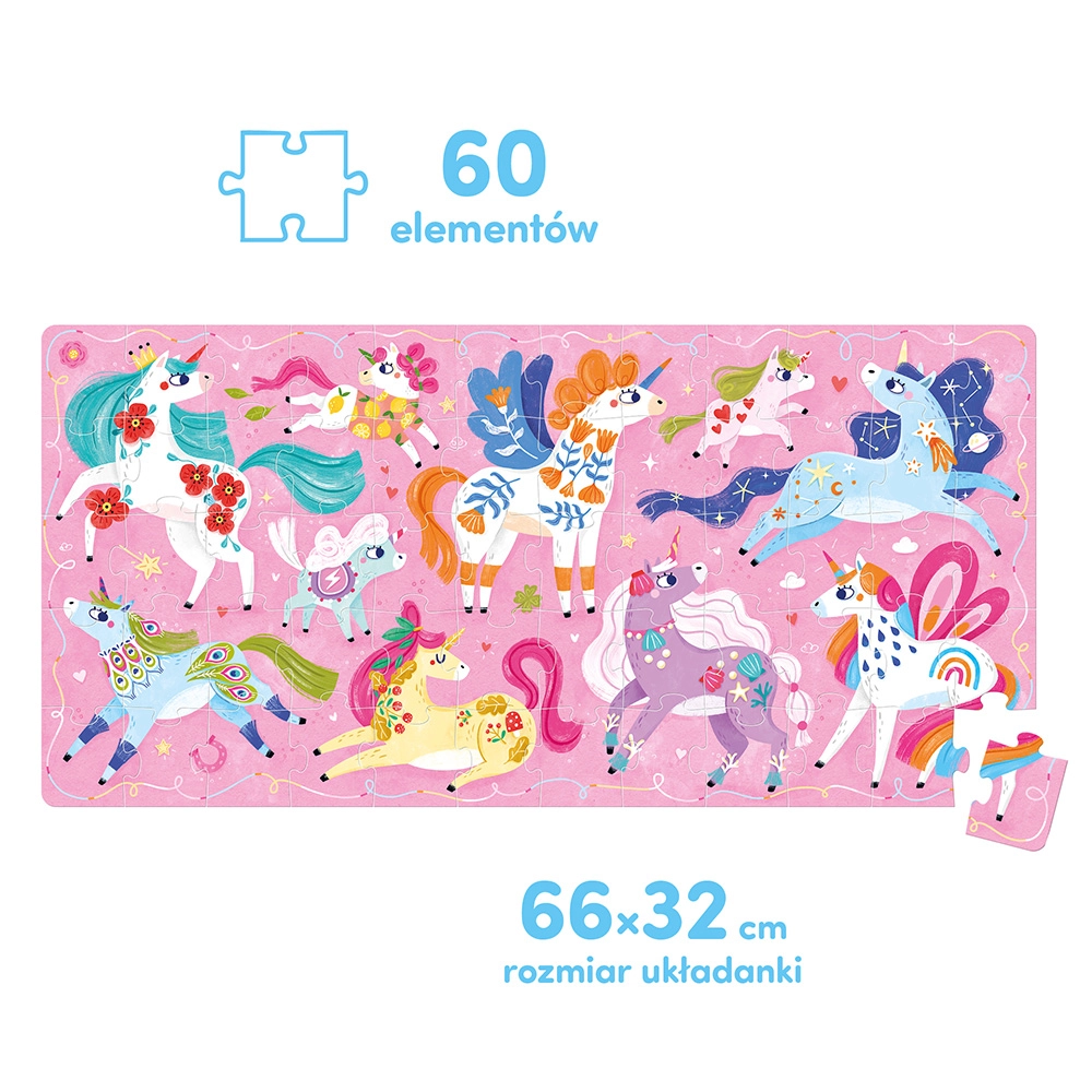 Ta bajecznie kolorowa układanka to doskonały pomysł na mądrą i rozwijającą zabawkę dla przedszkolaków, szczególnie tych, które lubią bajki, baśnie i magiczne opowieści. Układając puzzle, dzieci mogą doskonalić małą motorykę, spostrzegawczość, cierpliwość i koncentrację oraz pomysłowość. Spróbujcie: ułożyć puzzle, zwrócić uwagę na różne detale, policzyć jednorożce i pegazy, sprawdzić czym się od siebie różnią, a w czym są podobne, wymyślić własne baśniowe historie i snuć opowieści o zaczarowanej krainie, przerysować jednorożce albo narysować własne magiczne konie i ich przyjaciół. Produkt jest umieszczony w wygodnym opakowaniu z uchwytem. Szczegóły: • pięknie zilustrowane puzzle zachęcają do różnorodnych zabaw, • ilustracje, forma i treści zostały dostosowane do wieku dziecka, • ćwiczy sprawność rączek oraz rozwija spostrzegawczość i wyobraźnię, • doskonały pomysł na prezent dla przedszkolaka, • puzzle zostały wymyślone i wyprodukowane w Polsce. Wymiar układanki: 66.0 x 32.0 cm Wymiary opakowania: 16.5 x 19.5 x 5.0 cm
