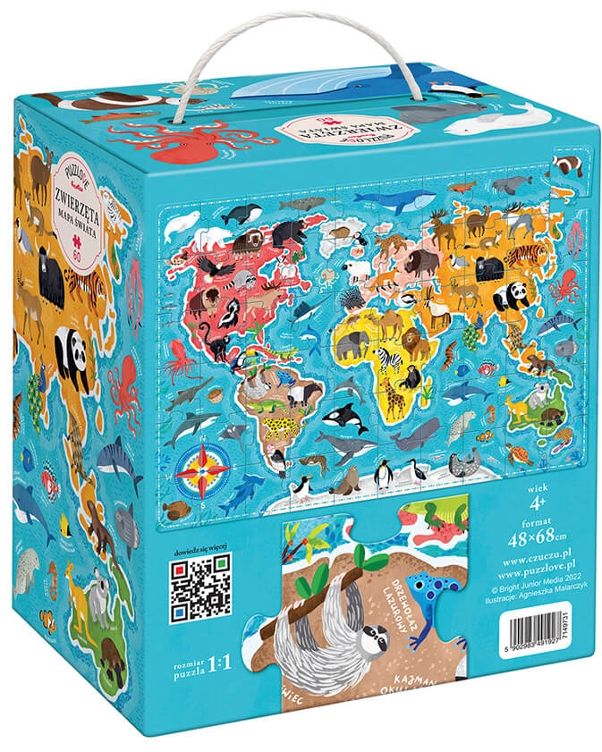 Ahoj, przygodo! Wyruszamy w puzzlową podróż dookoła świata! Duże 60-elementowe edukacyjne puzzle przedstawiają kontynenty, oceany i zwierzęta, które zamieszkują różne zakątki globu. To doskonała inspiracja, aby dzieci podjęły puzzlowe wyzwanie, poznały fascynujące zwierzęta świata i zainspirowały się do dalekich podróży. Puzzle inspiruję do mnóstwa rozwijających aktywności: ułóżcie je, a następnie ćwiczcie cierpliwość i spostrzegawczość, szukając różnych szczegółów na ilustracji. Zainspirujcie się do zdobywania wiedzy o świecie. CzuCzu wie, czym jest radość układania! Bawcie się tak, jak lubicie! • ułóżcie puzzle samemu lub z rodziną i przyjaciółmi. • puzzle inspirują do pierwszych lekcji geografii i przyrody na wesoło. • zapoznajcie się z różnorodnymi zwierzętami z ilustracji: są tu na przykład mięczaki, ryby, ptaki i ssaki, największe zwierzę świata i niewielkie bezkręgowce. Które są dla was zupełnie nowe? • poszukajcie różnych ciekawostek o zwierzętach świata! • ćwiczcie w spostrzegawczość: na zmianę szukajcie na ilustracji zwierzaków. • oprawione w ramkę puzzle możecie możecie powieście na ścianie. • czas na podróże palcem po mapie: wymyślcie trasę własnej wycieczki po świecie albo opowiedzcie o swoich wojażach i ulubionych zwierzętach. W pudełku znajdziecieL • 60 elementów Wymiar po ułożeniu: 48.0 x 68.0 cm Pudełko: 16.5 x 19.0 x 11.0 cm