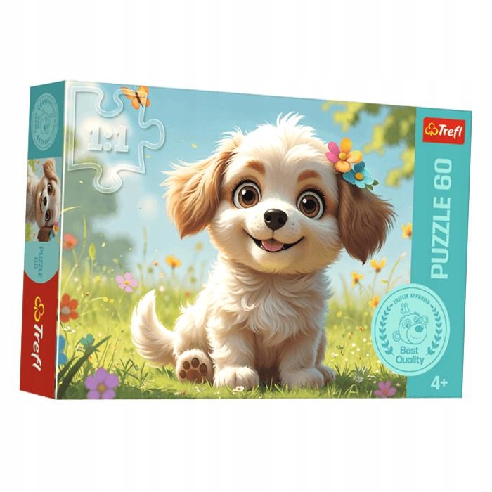 Szczeniaczkiem być! to puzzle składające się z 60 elementów, zaprojektowane z myślą o małych fanach zwierząt. Puzzle przedstawiają uśmiechniętego szczeniaczka na łące. Po ułożeniu układanki powstanie obrazek o wymiarach 330x220 mm.