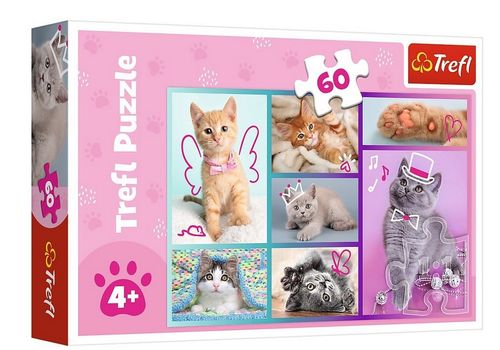 Słodkie kociaki to puzzle składające się z 60 elementów. Po ułożeniu układanki powstanie obrazek o wymiarach 330x220mm.
