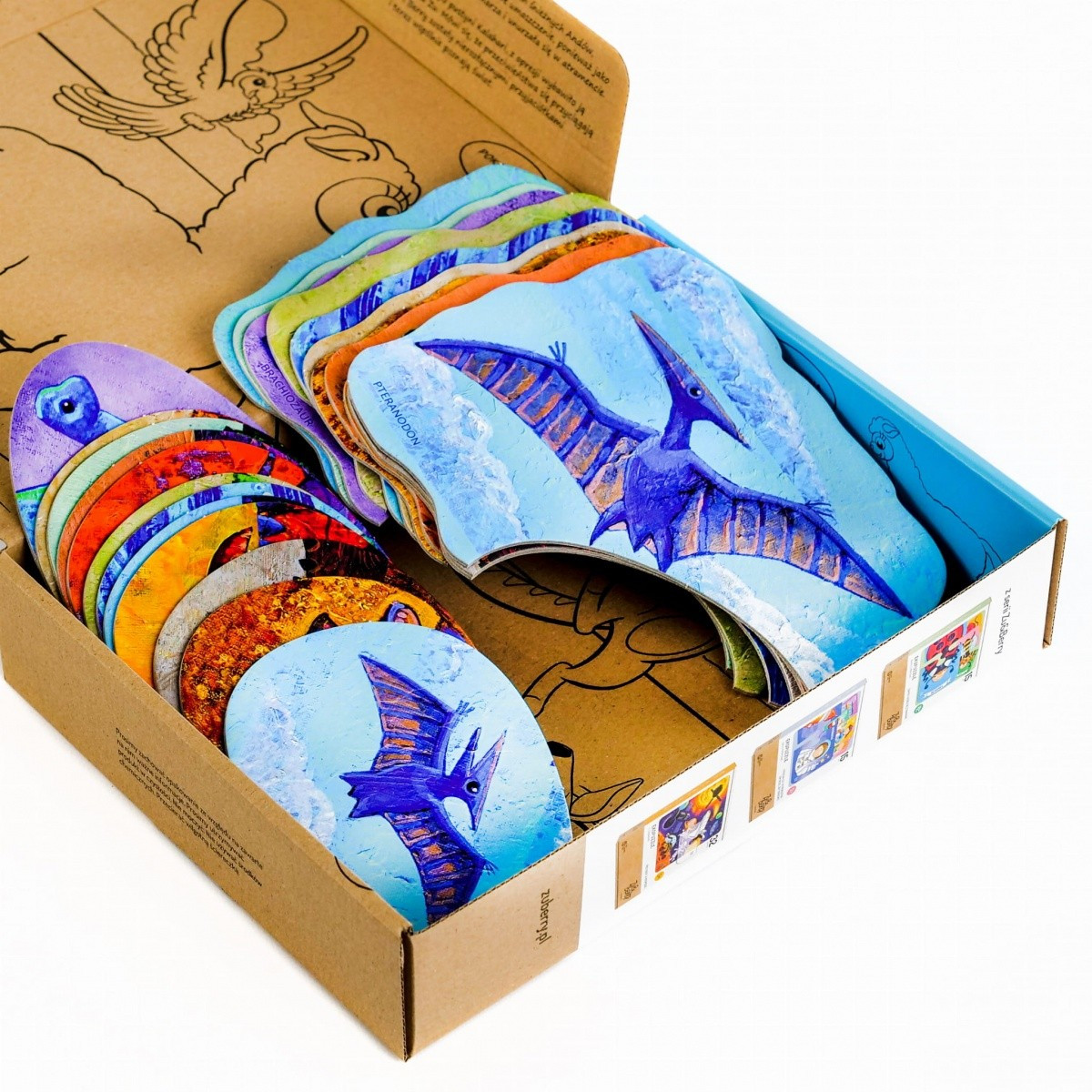 Puzzle Dinozaury i ich dzieci, w których łączymy w pary dorosłego dinozaura i młodego osobnika, są nie tylko narzędziem wspomagającym motorykę małą u dzieci. Dają też okazję do rozmowy o prehistorycznych gadach oraz zainspirowanych nimi smokach, ale również o relacjach między rodzicami a dziećmi. Do zestawu dołączone są zadania, które pozwalają ćwiczyć wiele umiejętności. Z kolei przedstawione ciekawostki poszerzają wiedzę nie tylko dziecka, ale i rodzica.