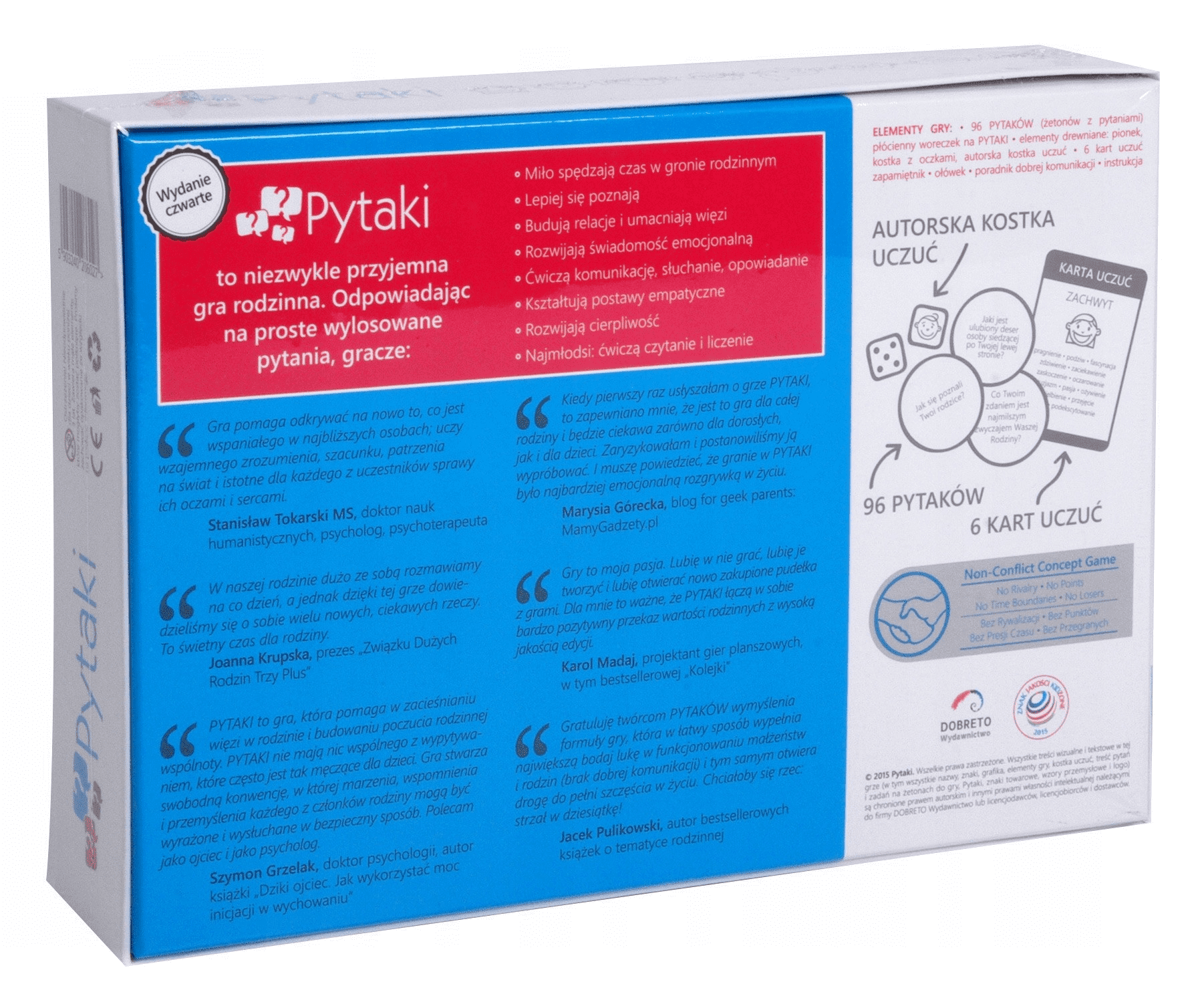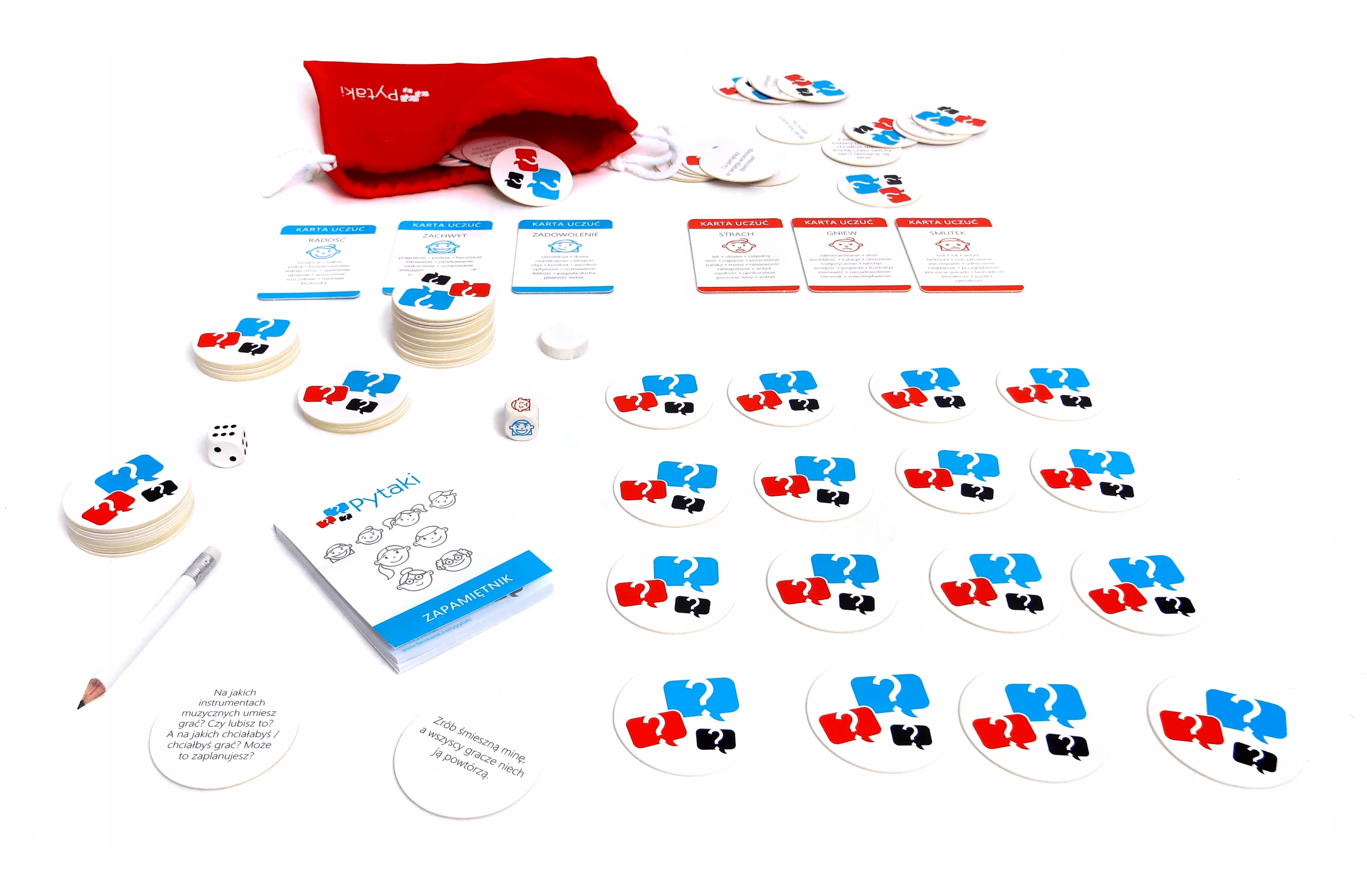 Otwierasz i możesz grać: Gra „Pytaki” jest przyjemną, prostą grą integracyjną dla całej rodziny. Dzięki intuicyjnej mechanice, w „Pytaki” można zacząć grać właściwie od razu. To ważne, ponieważ wiele osób nie lubi grać w gry ze względu na ich skomplikowane zasady. Wystarczy, że tylko jedna osoba przeczyta wcześniej instrukcję i jest w stanie wprowadzić w rozgrywkę całą rodzinę w ciągu minuty. Wiele korzyści dzięki pomysłom i prostocie: Rozgrywka polega na tym, że gracze siadają razem i po kolei (lub według innego z proponowanych kluczy) losują z woreczka „Pytaki” czyli żetony, a następnie odpowiadają na wylosowane pytanie lub wykonują zadanie. Pytania dotyczą różnych dziedzin życia a refleksja nad nimi i słuchanie odpowiedzi innych zapewniają graczom: • lepsze poznanie się, • rozwój samoświadomości emocjonalnej, • ćwiczenie komunikacji (słuchania, opowiadania), • kształtowanie postaw empatycznych, • ćwiczenie cierpliwości, • wspieranie nauki czytania najmłodszych. Dla kogo? Czterolatków, nastolatków, dla rodziców i dla dziadków. Dla całej rodziny. Po co? Aby budować lesze i bliższe relacje rodzinne, rozwijać umiejętności komunikacyjne i spędzać czas w ciepłej, przyjemnej, radosnej atmosferze. „Pytaki” świetnie się prezentują. Gra jest teraz bardzo atrakcyjna nie tylko merytorycznie, ale również graficznie i edytorsko. Zdecydowanie polecamy każdej rodzinie. Doskonale sprawdzi się też jako prezent na święta, urodziny, dzień mamy, taty, babci i dziadka. „Pytaki okazały się znakomitą formą spędzania czasu dla całej naszej rodziny – spodobały się zarówno chłopcom jak i dziewczynkom, małym i starszym. Rozgrywki są dla nas wszystkich świetną zabawą i okazją do lepszego poznawania się” – Janusz Wardak, wicedyrektor szkoły „Żagle” stowarzyszenia Sternik.