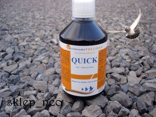 Dodając Quick (jod i żelazo), zwiększymy wydajność gołębi. Wzbudzenie funkcji tarczycy, zwiększa wytrzymałość i prowadzi, w połączeniu z żelazem, do większej szybkości. W połączeniu z Dosto-Oregano Flüssig 12% możliwe są zdumiewające efekty, przede wszystkim u młodych gołębi.Połączenie Quick i Dosto-Oregano Flüssig 12% zabezpieczy, dodatkowo młode poczują się jak napompowane balony. Hodowcy, którzy co roku mają problemy z chorobom młodych powinni spróbować tej metody. Quick i Dosto-Oregano Flüssig 12% można również podać na karmę.