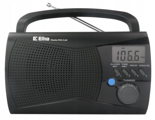 Przenośny odbiornik radiowy z wyświetlaczem LCD. Zakres fal DŁUGICH i UKF. Wyświetlacz częstotliwości. Funkcja zegara z programowaniem włączenia odbiornika lub budzeniem sygnałem dźwiękowym. Gniazdo słuchawkowe. Wygodna rączka do przenoszenia. Zasilanie sieciowe lub bateryjne.