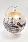 Ta ręcznie malowana bombka na stojaku z pejzażem zimowym to niepowtarzalne dzieło sztuki, wykonane z dbałością o każdy szczegół. Wysokiej jakości szkło i precyzyjne ręczne malowanie odwzorowują zaśnieżone domki i lasy, tworząc unikalną ozdobę o wymiarach 8 cm średnicy, która wnosi autentyczny świąteczny klimat do każdego wnętrza.