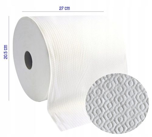 Wszystko to uzupełnia praktyczność i łatwość użycia. Z szerokością rolki 27 cm i długością 65 m, ten ręcznik jest energooszczędny w zużyciu, a jego biała barwa podkreśla czystość. To więcej niż ręcznik - to klucz do profesjonalnej higieny, dostosowany do Twoich unikalnych potrzeb w salonie czy gabinecie.