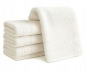 Ten wysokiej jakości ręcznik kąpielowy frotte marki 4HORECA z serii CORFU w klasycznym białym kolorze o wzorze greckim nie tylko zachwyca eleganckim designem, ale także wyjątkową chłonnością. Wykonany z 100% naturalnej bawełny o gramaturze 450 g/m², szybko absorbuje wilgoć, zapewniając suchą i komfortową skórę bez zbędnego tarcia.