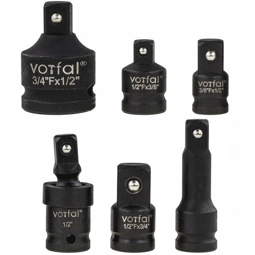 Komplet zawiera 6 niezbędnych elementów, w tym adaptery redukcyjne 3/4" -> 1/2", 1/2" -> 3/8", 3/8" -> 1/2", 1/2" -> 3/4", przegub 1/2" oraz przedłużkę 1/2" o długości 75 mm, umożliwiając pracę z różnymi rozmiarami nasadek i dostęp do trudno dostępnych miejsc.