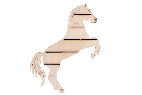 Półka, ekspozytor "Koń" wycięta ploterem laserowym ze sklejki drewnianej o grubości 6 mm, niemalowana.