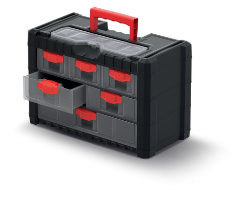 Regał KMC301 wyposażony w 6 szufladek w 3 rozmiarach oraz organizer z przeźroczystą pokrywą w obudowie regalika. Konstrukcja została wyposażona w praktyczną rączkę do łatwego transportu. Szufladki zostały wzbogacone o zabezpieczenie przed wysunięciem lub wypadnięciem z obudowy. Regał można postawić lub powiesić na ścianie. Kompaktowa obudowa pozwala na stawianie dowolnych regalików z tego rodzaju jeden na drugim. Polecany tam gdzie jest wymagany porządek, przejrzystość asortymentu oraz mobilność.