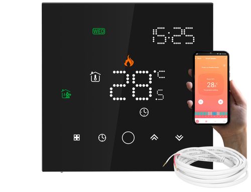 Programowalny regulator temperatury LEO to nowoczesne urządzenie z podłogowym czujnikiem temperatury oraz możliwością zdalnego sterowania za pomocą telefonu lub tabletu z systemem Android lub iOS.