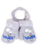 Praktyczne, chłopięce rękawiczki w kolorze szarym z uroczym samolotem. Zakończone futrzanym mankietem. Dwuwarstwowe, w środku wykończone miłym futerkiem. Świetnie prezentują się na dłoniach.