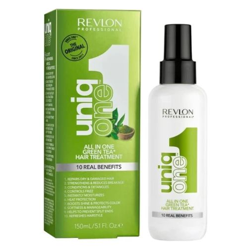 Revlon Uniq One All in One Green Tea, wielozadaniowy kosmetyk do pielęgnacji włosów, który odmienił rynek salonów fryzjerskich na całym świecie. Zapewniając 10 prawdziwych korzyści w jednym spektakularnym produkcie, UniqOne dba o Twoje włosy.