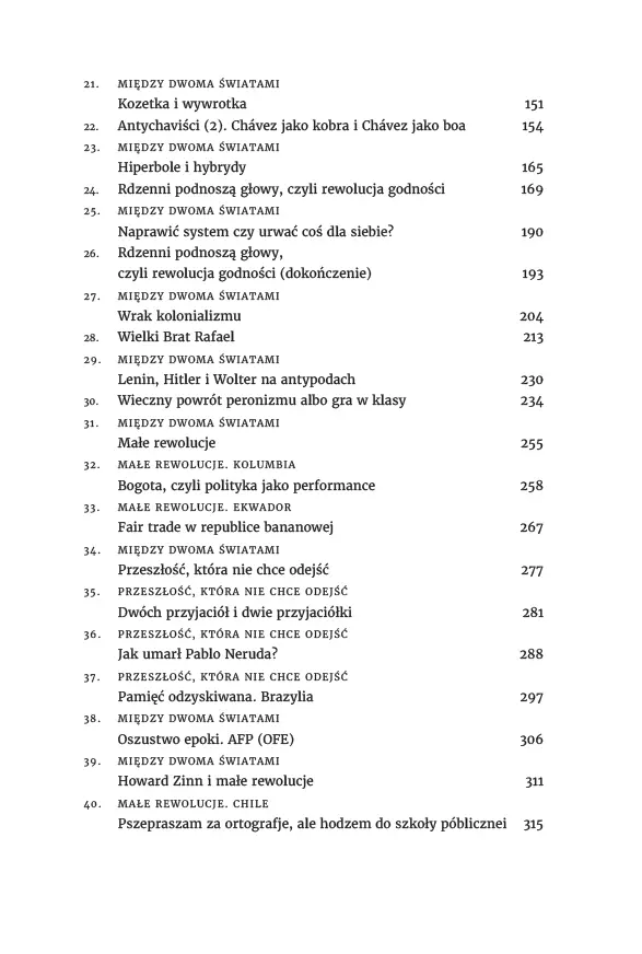 Przez ostatnie dwie dekady Ameryka Łacińska przeszła ogromne, czasem wręcz rewolucyjne, zmiany. Zmarł „wieczny” Fidel Castro; zakończyła się wieloletnia wojna domowa w Kolumbii; Brazylia przeżywała swój gwiezdny – a potem mroczny – czas; Wenezuelą, Boliwią i Peru po raz pierwszy w historii rządzili przywódcy będący potomkami rdzennych mieszkańców, a w Chile, Argentynie i Brazylii – po raz pierwszy kobiety…