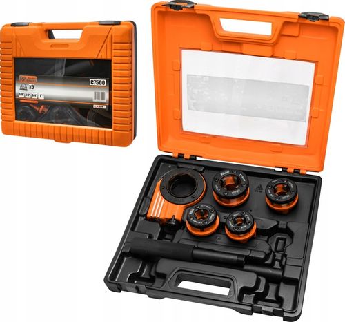Zestaw składający się z 5 elementów umożliwia precyzyjne gwintowanie rur o różnych średnicach: 3/8" (10 mm), 1/2" (12,5 mm), 3/4" (19 mm) i 1" (25 mm). Ergonomiczna rękojeść z gąbką gwarantuje wygodny i pewny chwyt podczas pracy.