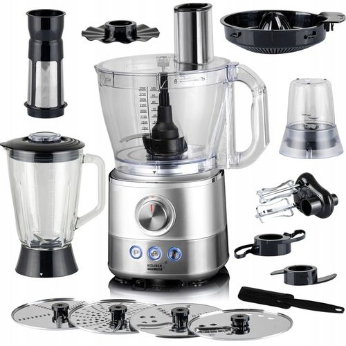 ✅ Załączone wyposażenie: malakser, ostrze ze stali, ostrze plastikowe, 4 x tarcze (do frytek, placków ziemniaczanych, do tarcia i krojenia w plastry), szklany blender kielichowy, filtr do blendera, młynek do kawy, trzepaczka, wyciskarka do cytrusów, tarcza emulgacyjna