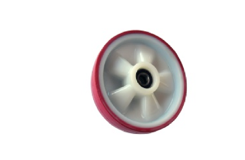 Twardość 90 ShA, nie niszczący i nie brudzący posadzek, trwałe połączenie wtryskiwanej oponki z elastomeru poliuretanowego z piastą z poliamidu PA6 koła, ma małe opory toczenia i skrętu, cichobieżny, wytrzymały na rozrywanie i odkształcenia, odporny na wiele czynników chemicznych i oleje.